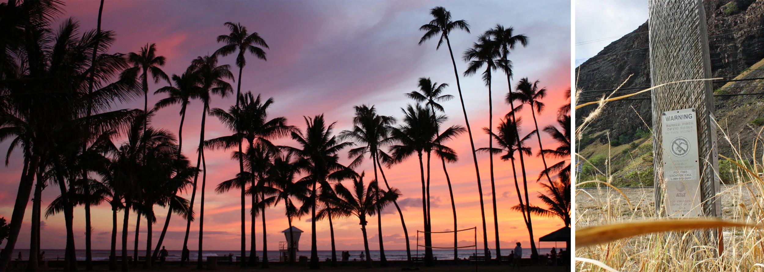 Figure 8. At Hawai‘i’s Sans Souci Beach (left), the only remnant of the original transpacific cable landing is a mention at the bottom of a restaurant menu. The poles that mark contemporary communications cables (right) blend into the dry landscape of O‘ahu’s west shore.